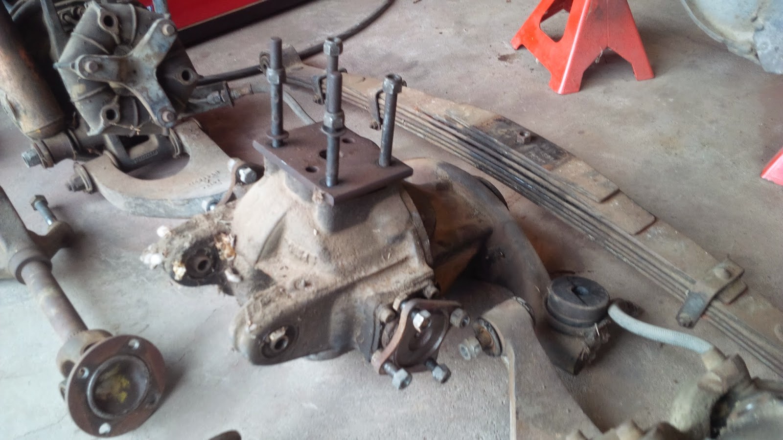 The final task to complete the rear end stripping was the differential. I tried to be smart about this one, as I knew there was going to be quite a bit of weight to it. The differential is mounted via three bolts, one that allows it to rotate up and down, and two that mount with rubber bushings to the frame to allow for vibration absorption. Before removing the bolts, I decided to use a jack to hold the weight when the differential comes loose, where I could simply keep it from falling and lower it safely. Having to wiggle it free, I temporarily removed the jack. Once free, I had to keep it from falling onto the ground so I grabbed one of the four leaf spring bolts which slipped out of my grip and ended up slicing my thumb open. Duct tape and blue shop rags kept the pressure up and the bleeding down so I could continue to work.