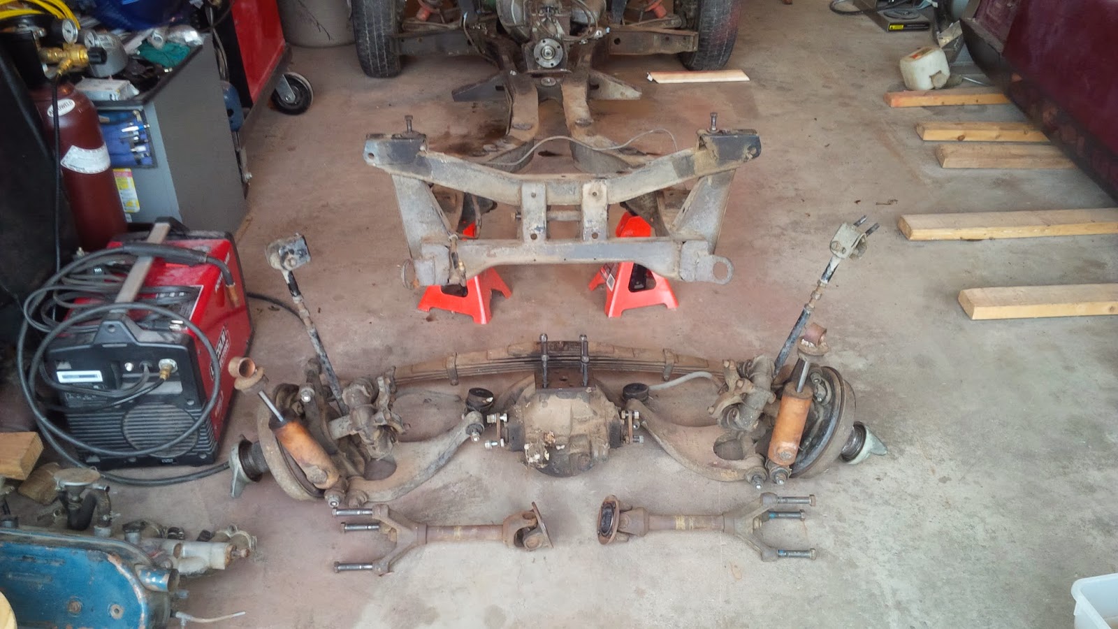Floating the frame, I removed both of the rear tires, as well as the leaf spring ends that attach to the left and right side uprights. Removal of the plate that holds the spring to the top of the differential was crucial as well. What I have really enjoyed about this project so far is how simply this car goes together – with the exception of the rotoflex couplings of course. Everything is simple bolted assemblies.