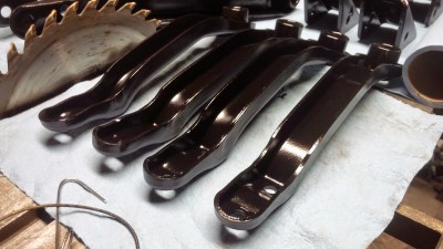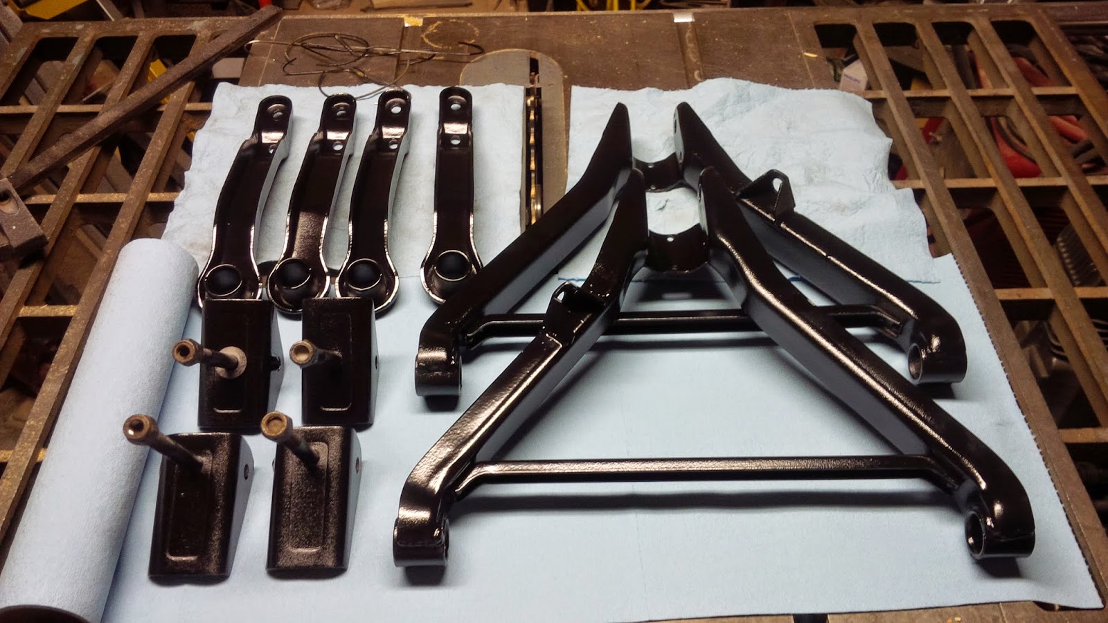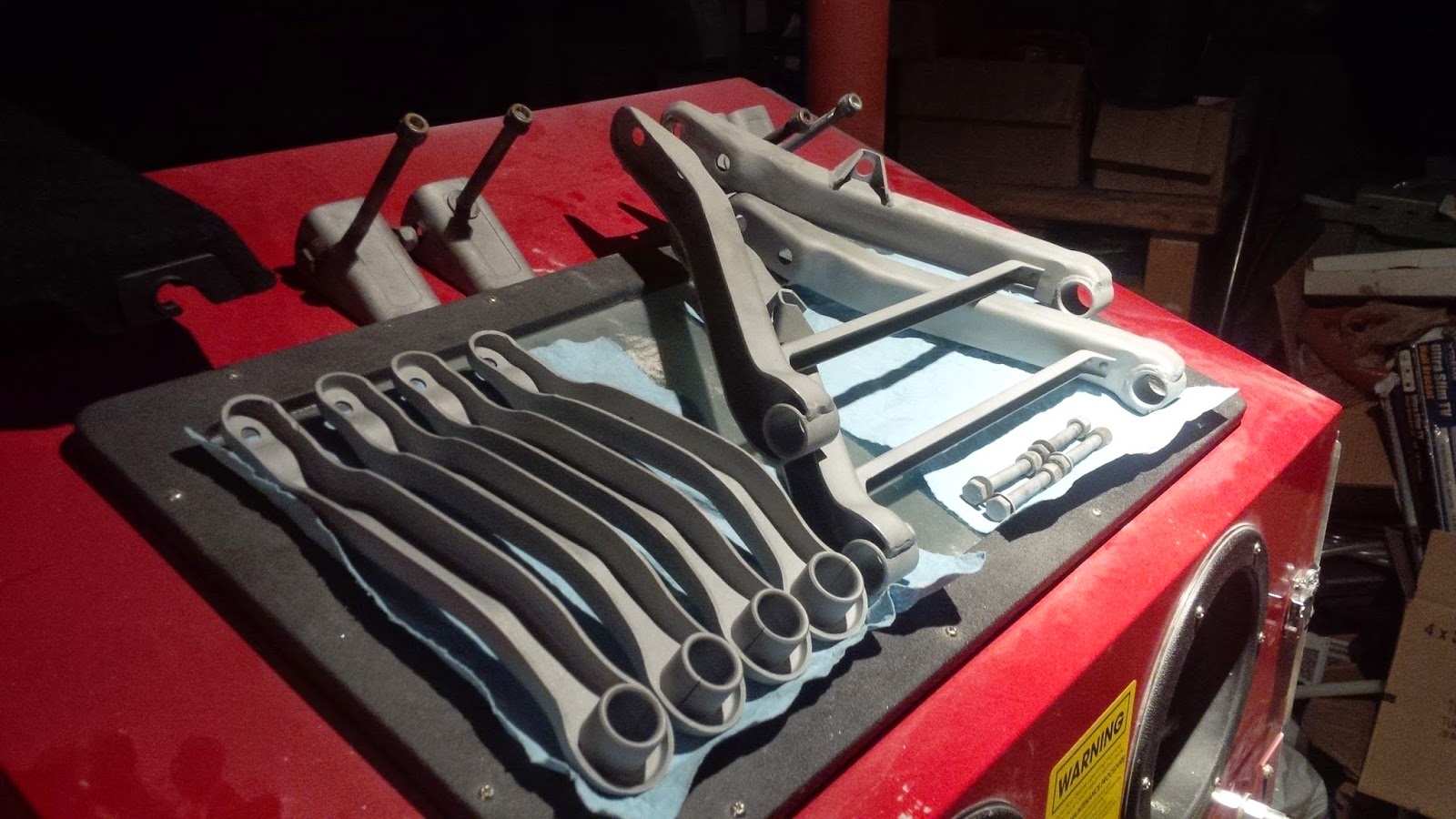 Polyurethane bushings made me indescribably excited, I knew that was going to be my next project. I mixed up another batch of the SPI epoxy primer that was used on the frame and aired up my spray gun. After an hour of enclosure in the basement, they were fully coated and ready to dry. Three days later (today) I took them off of their hangers and laid them out for inspection. I was a little thin on some parts of the control arms so I might touch them up, however the results were beautiful.