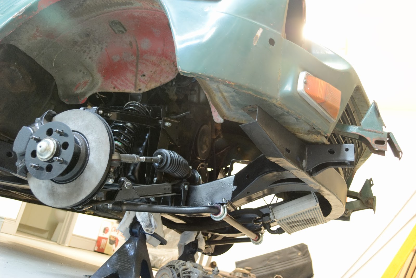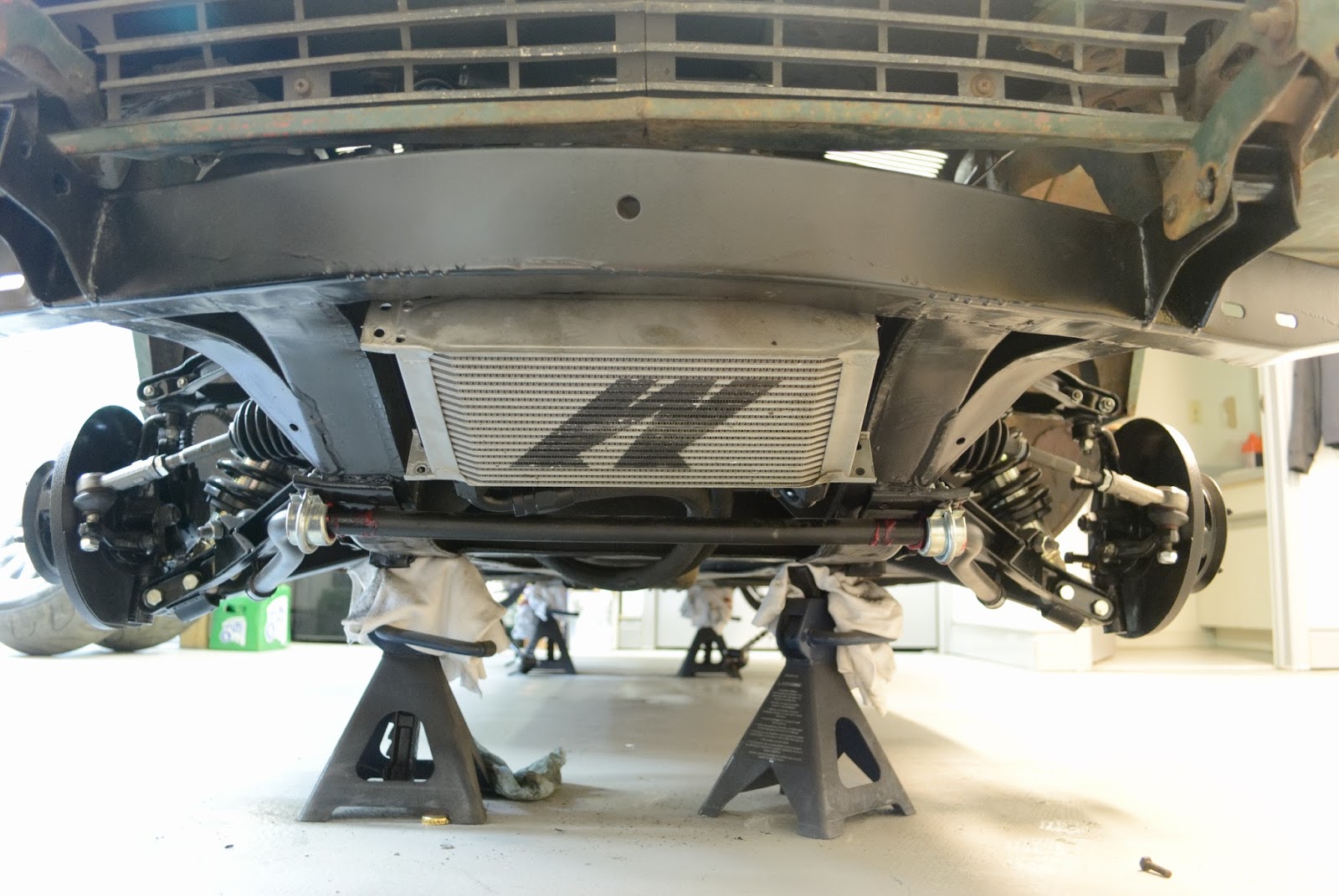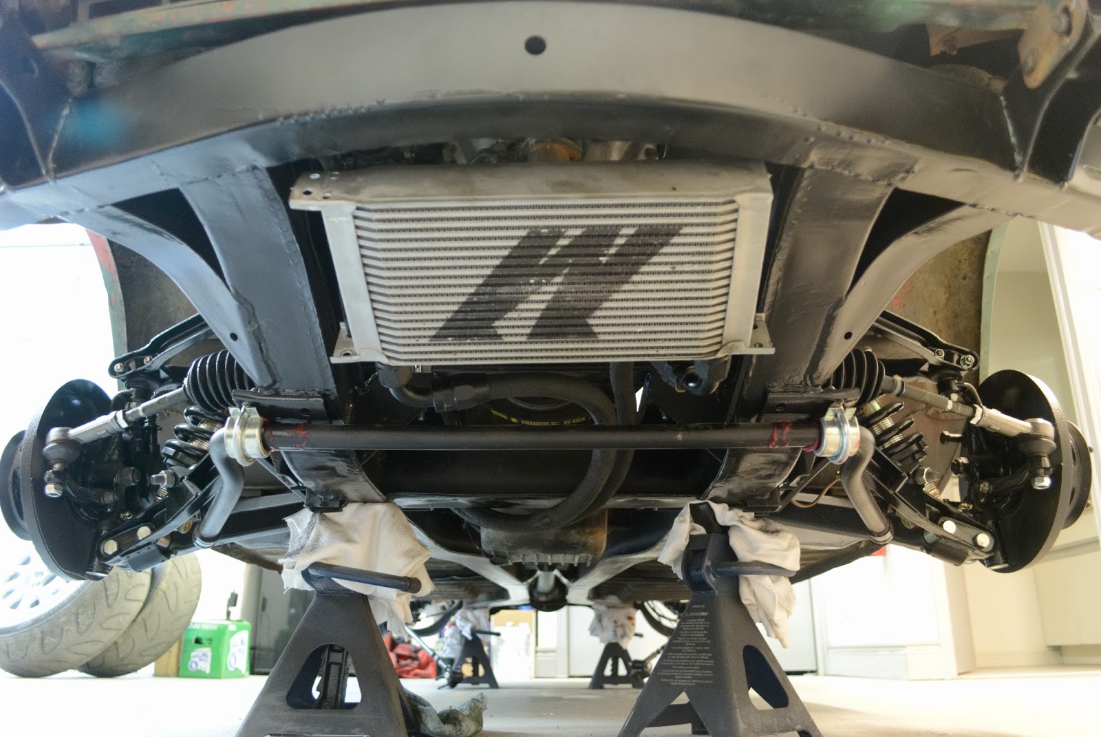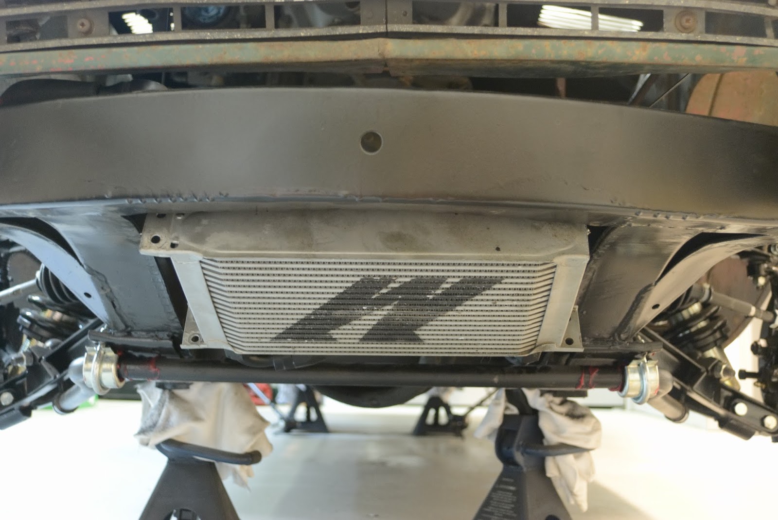 Just a short update. I’m working on mounting all of accessories on the car to get everything to fit properly. This includes an aftermarket oil cooler, a radiator and the OEM intake bits. I just have a bunch of photos for reference. Any drips in the primer on the frame I will be fixing so that the coat is uniform all around. Unfortunately most of the front end of the frame will need to be re-primed. The photos below are just rough ideas, nothing concrete yet. I will update the blog more when I have some more time available.