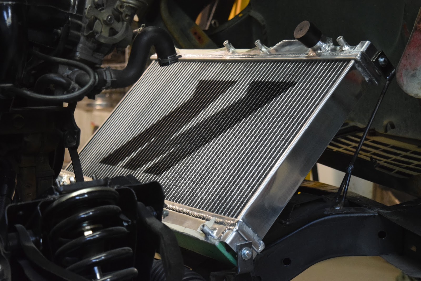 Now I will fully admit that Joe did not do the rest of the welding and it shows… I can’t say I’m proud in even the slightest of ways. With my expert skills on the angle grinder, I should be able to tackle my mountains of weld with the angle grinder and smooth everything out to make it look all pretty. Nevertheless, I’m very happy with the results. I have a radiator in the car and it supports its own weight. This makes me happy.