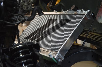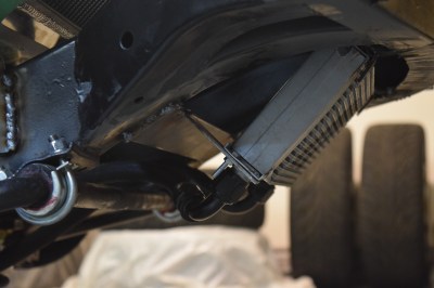 Over the weekend I was able to spend my afternoon, into the early hours of the next morning to get both my shiny new aluminum radiator and the nasty old oil cooler from the Evo-swapped Lancer mounted on the frame of the GT6. Life is good. Although I didn’t take pictures of it, I cut up the box that the radiator came in and taped off both the front and the back of the unit to ensure that I wouldn’t kill all of the fins prematurely. In addition, I used masking tape on both end tanks to minimize scratches during the installation and fabrication of the mounts.