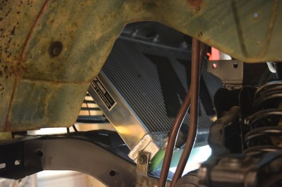 When I posted my last update with the cooling system, Joe and I made mounts for my oil cooler. I didn’t have the time or energy to prepare the frame for welding. I figured that it was already going to be a late night so I might as well make the most of it. After the radiator was mounted, I started work on the oil cooler. I took the blending wheel and wire wheel out and took the primer off the frame, put down some tacks and just like that, it was in position.