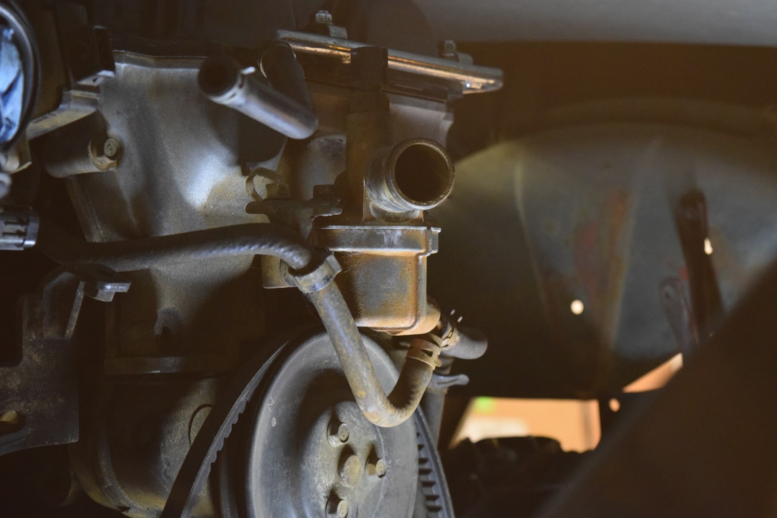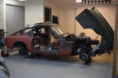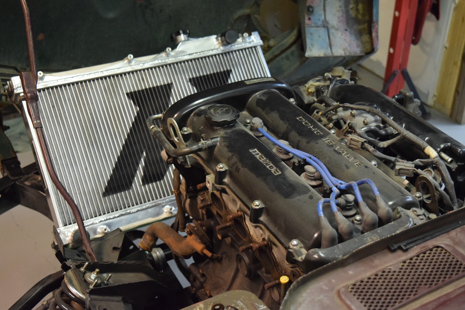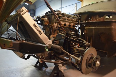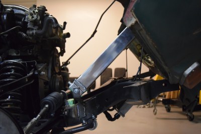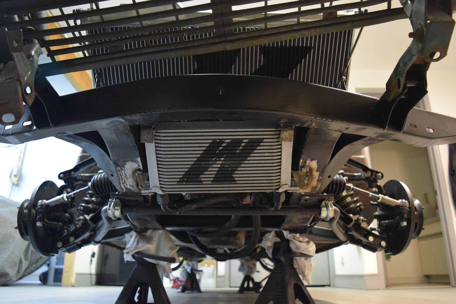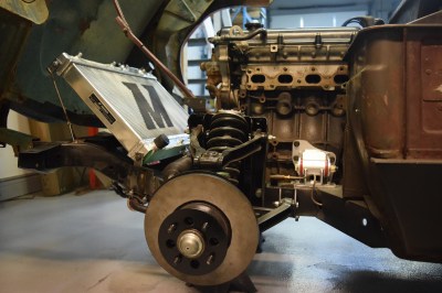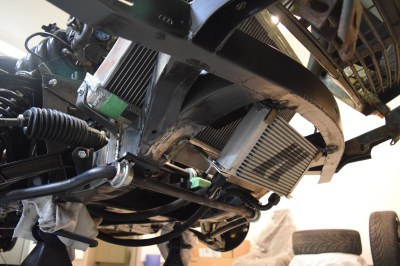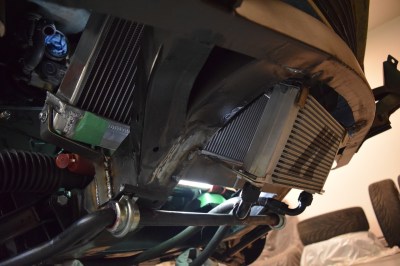 It’s slightly crooked as it currently sits but I’m very happy with it. All it needs is some precision hammering and it’ll be perfectly straight. I can’t really explain how excited this all makes me. Technically speaking, the engine can now hold all the fluids it needs to run, regardless of its currently lack-of-running condition. I reattached the oil lines temporarily, as I got sick of oil leaking all over the clean floors. They clear the new mounts and the sway bar perfectly – it’s like it was made to be.