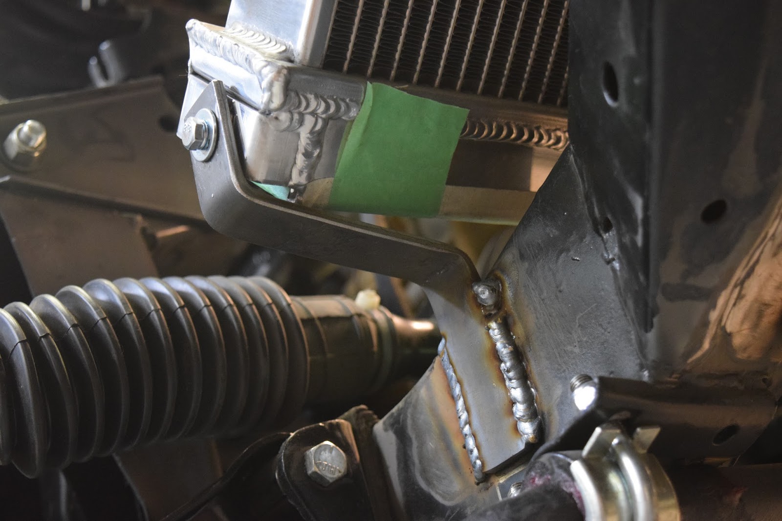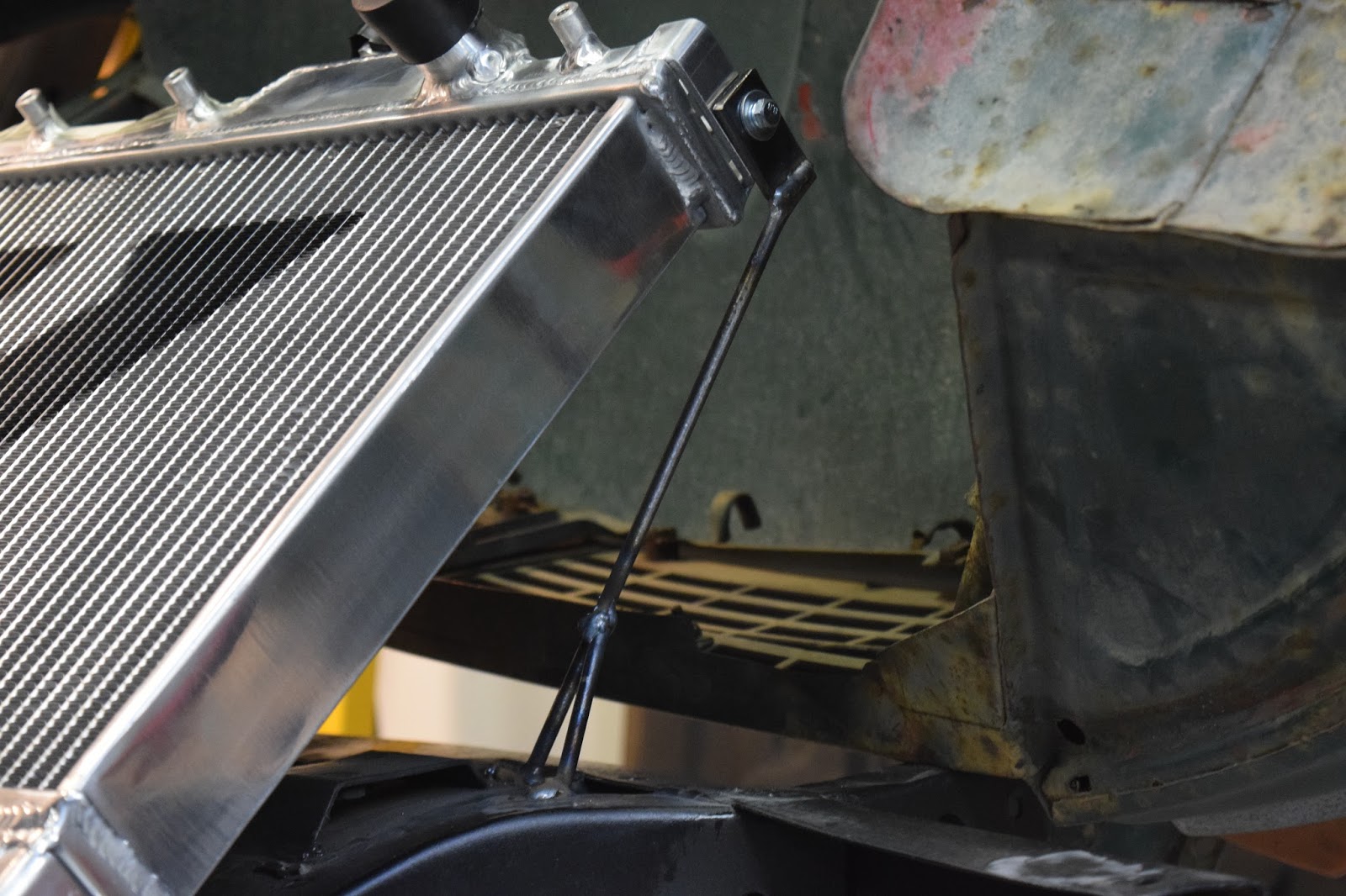 What I did was bent the metal rod to a shape that supports itself on a strong point of the frame and welded a tab on the other end to bolt onto the radiator. With the remainder of the rod, I was able to made two small supports that should help with any stress induced by vibration. If there is going to be a crack, it will crack at the top of the support as opposed to on the frame itself.