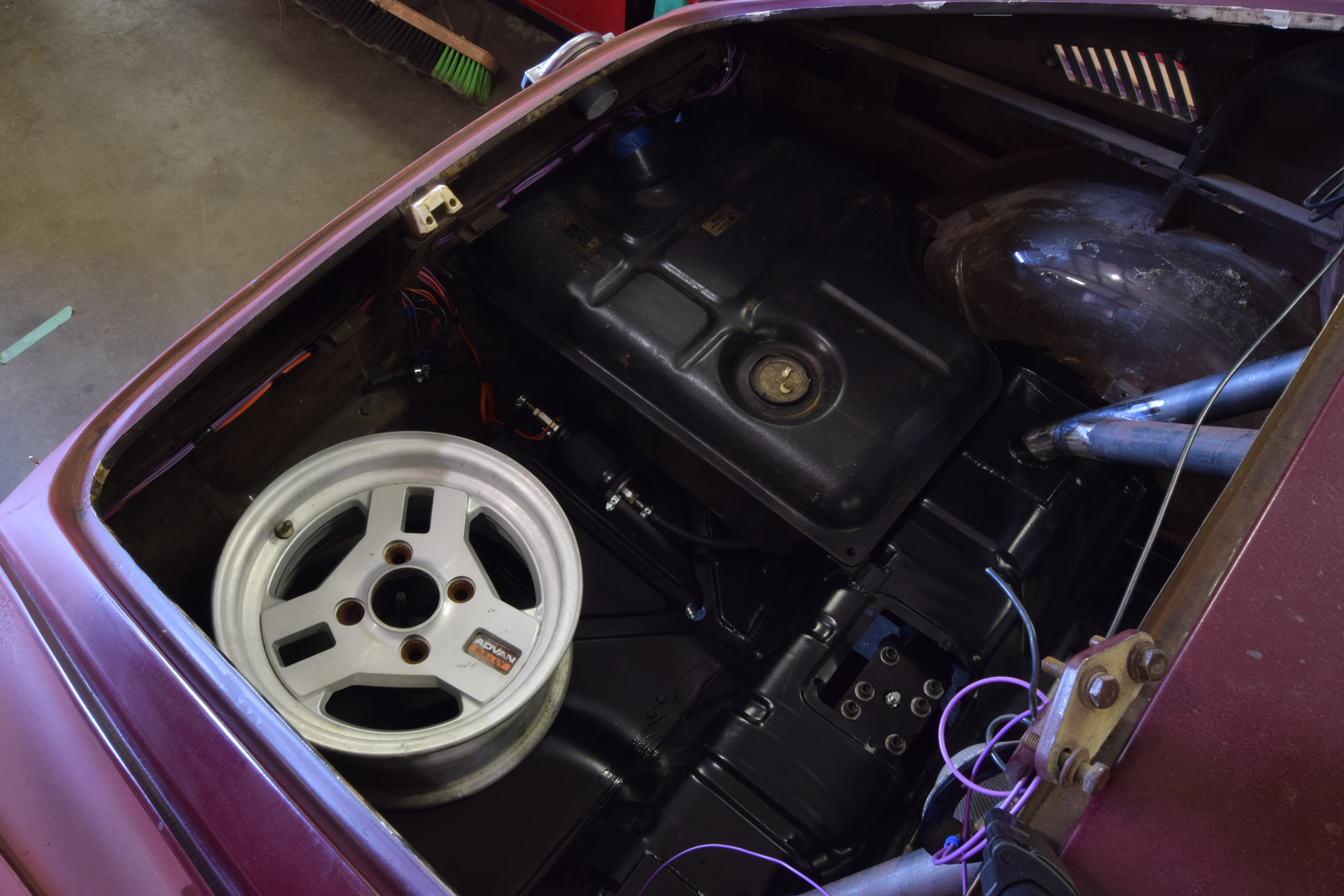 The last odds and ends within the fuel system are being finalized. With the fuel tank reinstalled, the location for the return line bung has been marked for drilling and welding. The Walbro fuel pump, running off of a relay fired by the ignition switch, is mounted, tested and happily wining away.